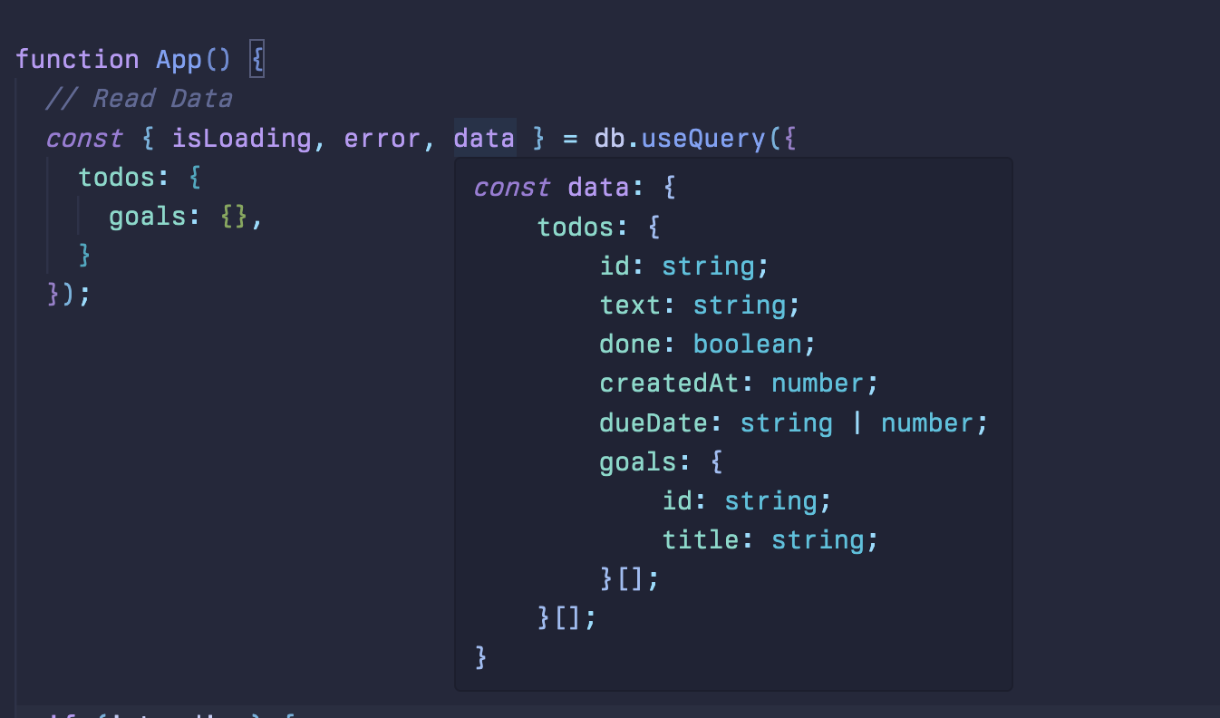 As your app grows, you may want to start enforcing types. When you're ready you can write a schema. If your schema includes goals and todos for example: